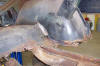 Lots of filler came off of here. A patch will be fabbed up to fix the rocker. The new quarter will cover the patchwork. |