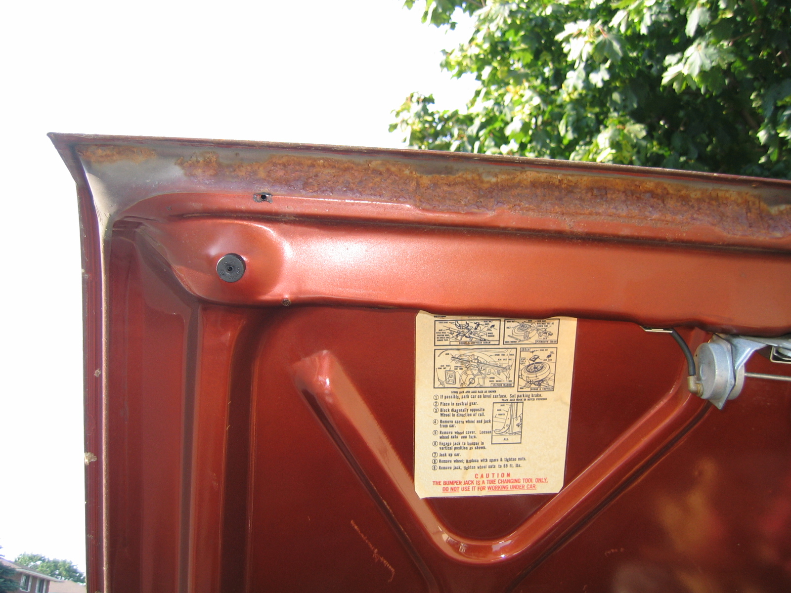 Jack instructions still there. Overall, the decklid is very nice. The rust along the back lip is surface rust. This car was rust-proofed. |